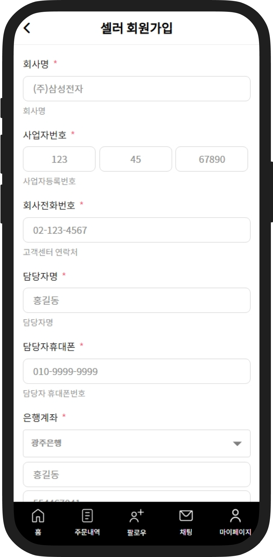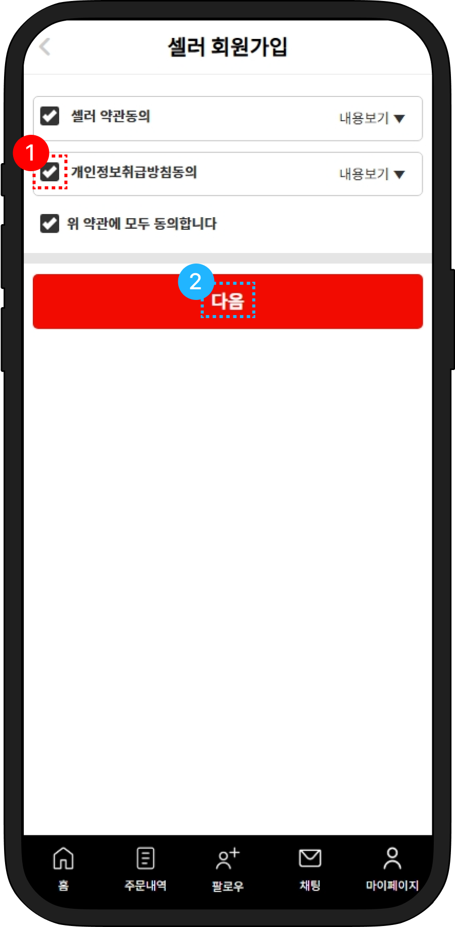 약관동의 후 판매자 회원가입 입력 필드 작성 후 가입 신청합니다. 관리자가 확인 후 승인하면 알림톡을 통해 승인 메시지가 날라옵니다.