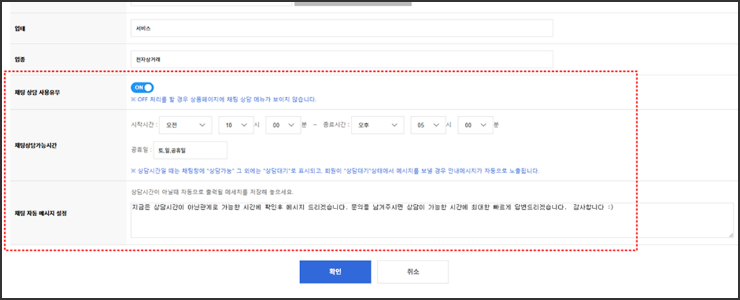 환경설정 - 판매자 기본정보수정 하단에 채팅 관련 설정을 해줍니다.