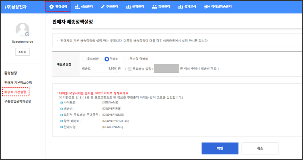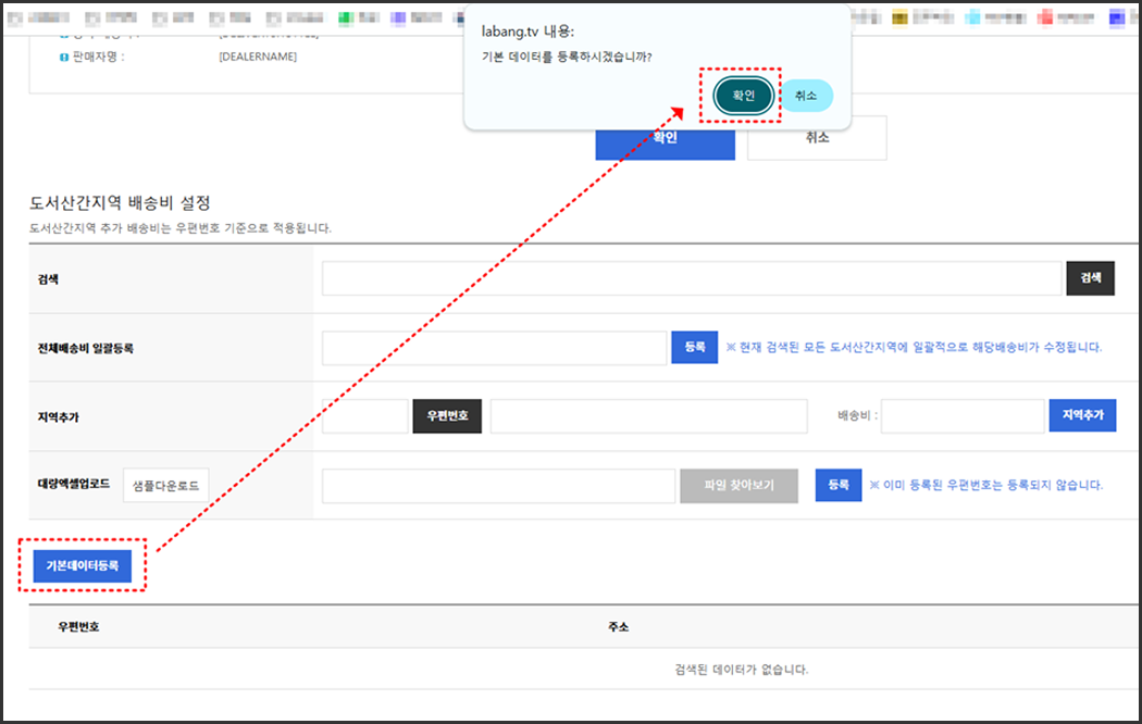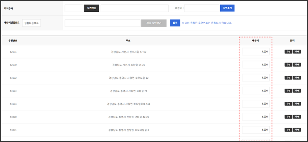 배송료 설정하고, 하단에 도서산간 배송비 설정까지 해줍니다.