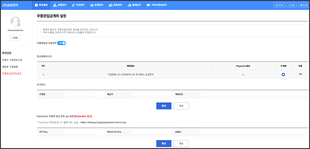 무통장 계좌정보 설정하고, PayAction 무통장 입금 연동 api 설정해줍니다.
