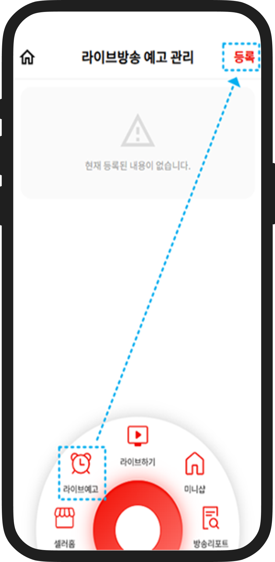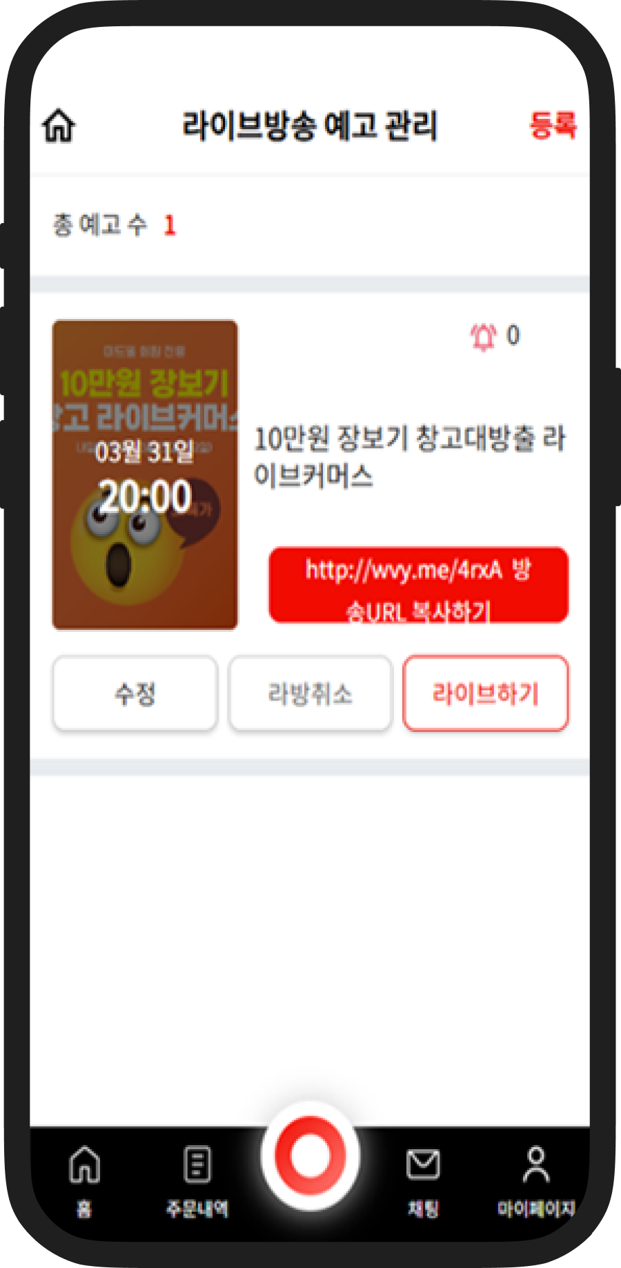 라이브예고 메뉴를 클릭하면 예고관리 페이지가 나오며, 등록버튼을 클릭합니다.
