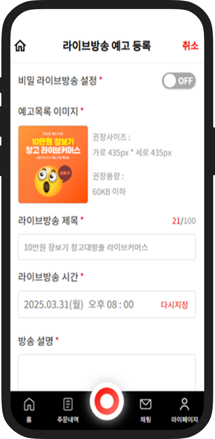 라이브방송 관련 내용을 입력하고 저장버튼을 누르면 예고등록이 마무리됩니다.