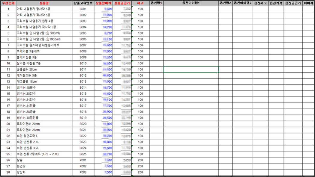 아래는 대량상품등록할 내용을 엑셀샘플양식에 작성한 예제입니다.