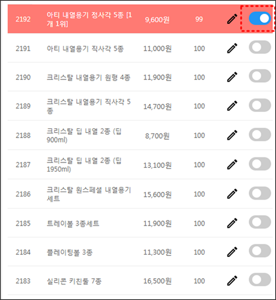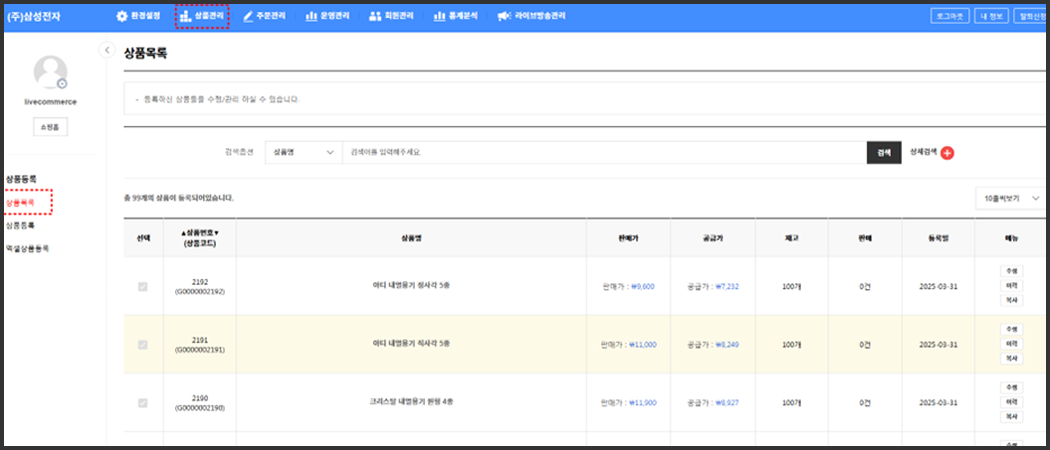 등록이 완료되고 상품 목록으로 이동해보면 등록되어 있는 상품 리스트가 나옵니다.