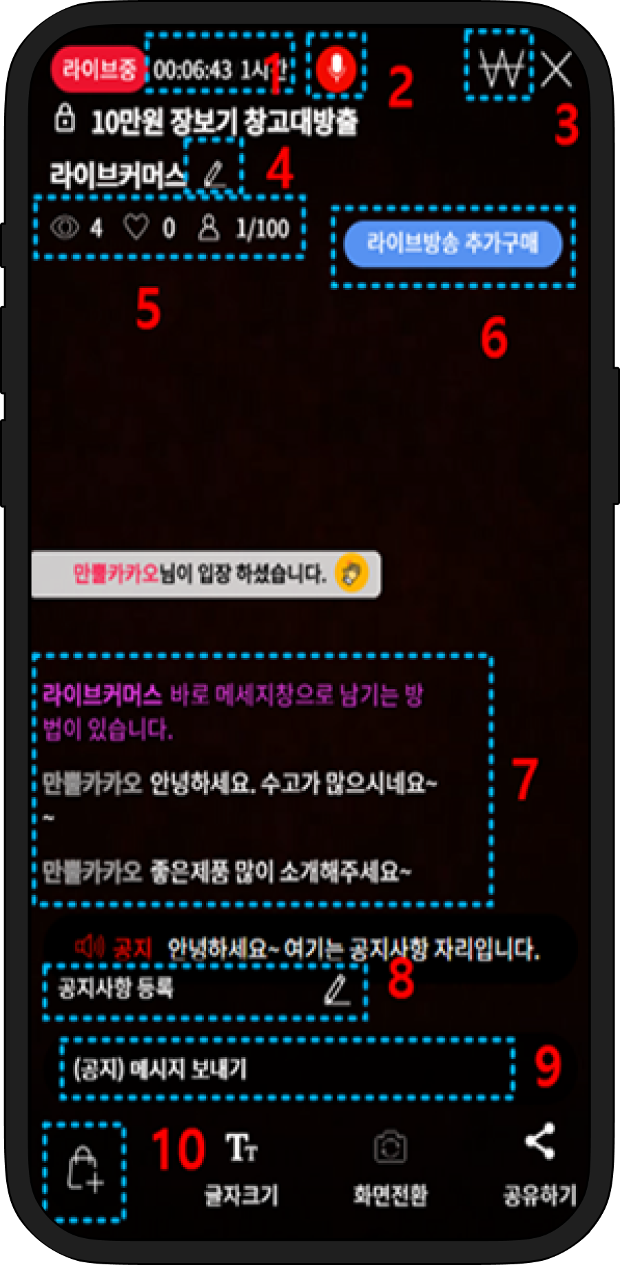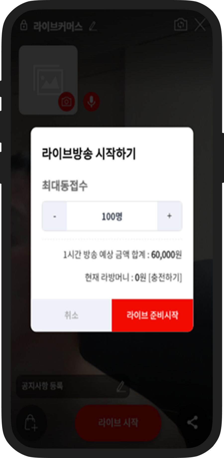 라이브방송은 100명/10분당 10,000원씩 차감되며, 알림톡발송은 팔로우회원과 알림받기한 회원에게 발송되며, 건당 25원씩 차감됩니다.