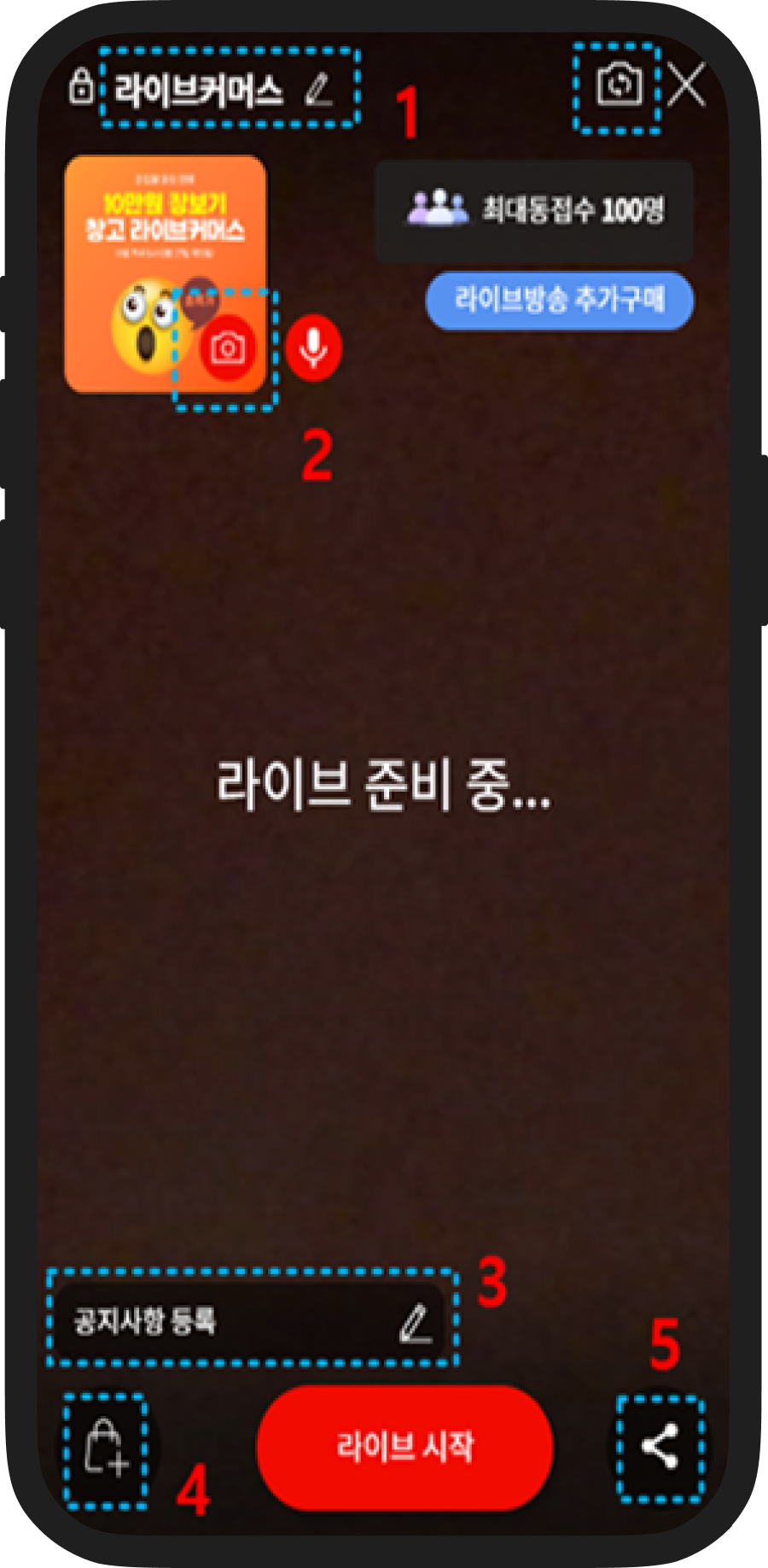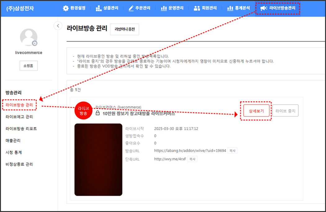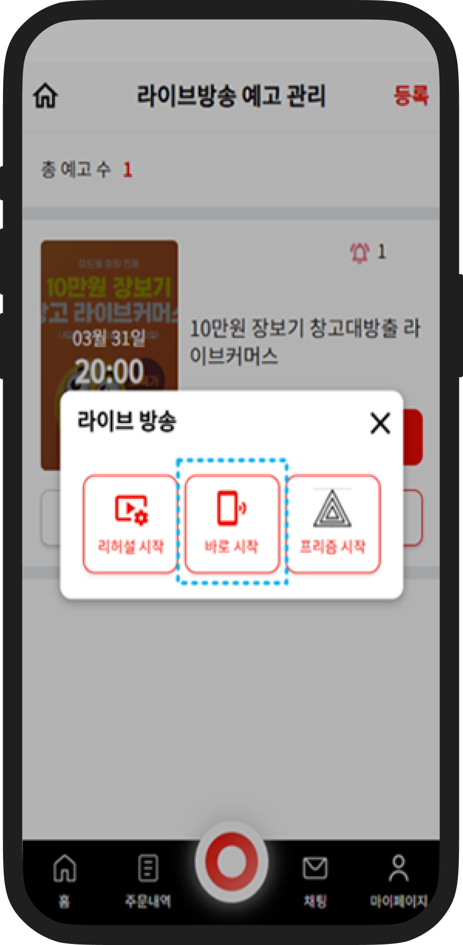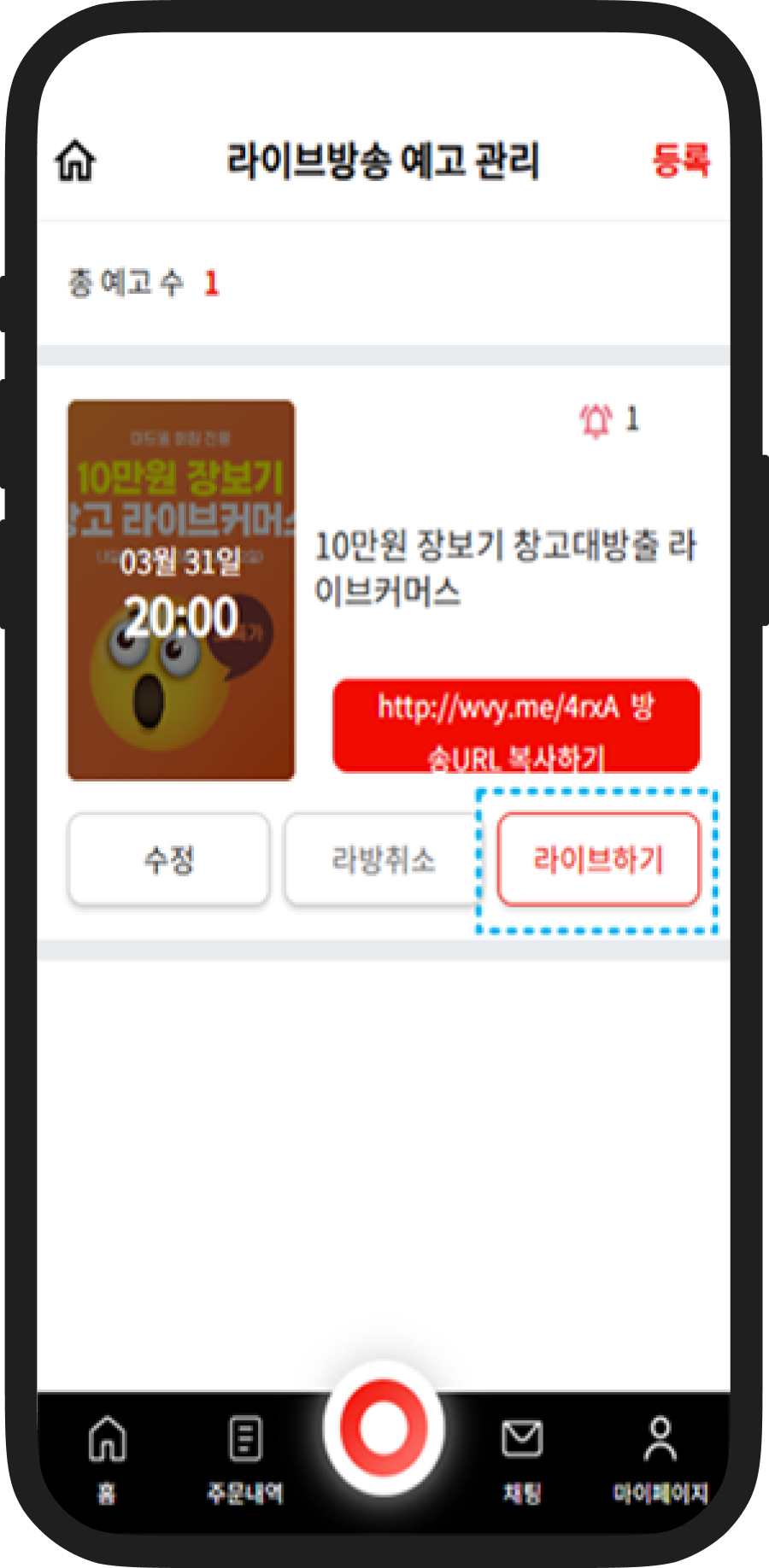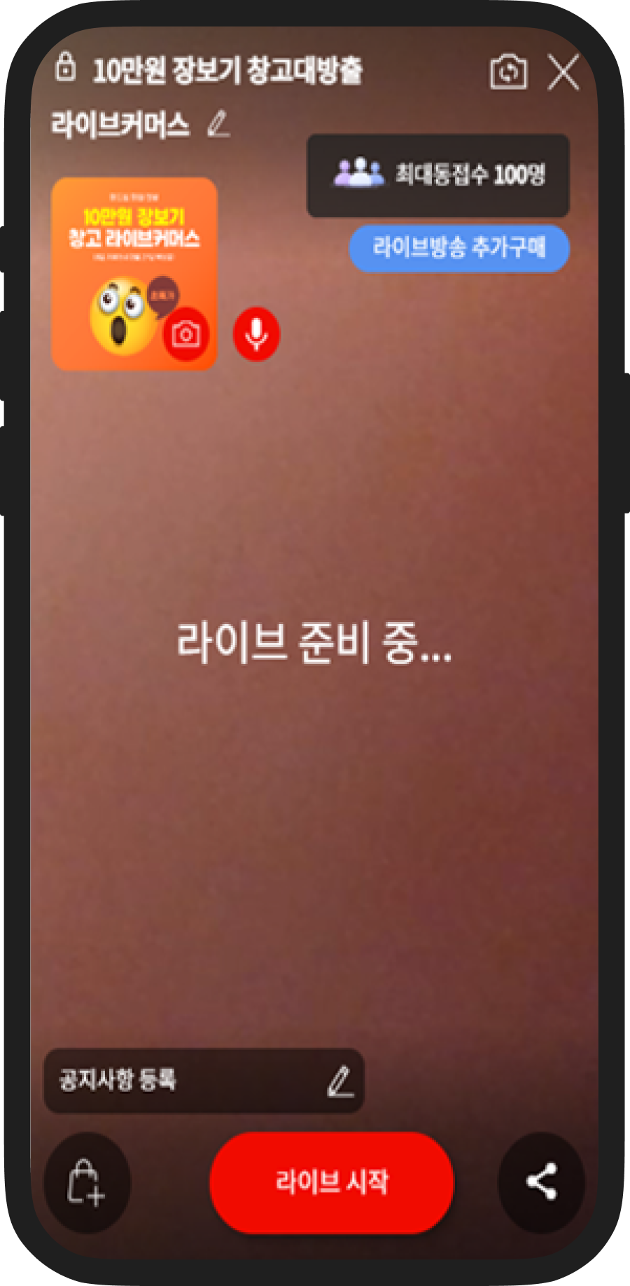 미리 등록해놓은 라이브예고를 통해서 라이브하기를 클릭하면 예고때 등록해 놓은 값들이 따라와서 라이브 준비페이지가 로딩됩니다.