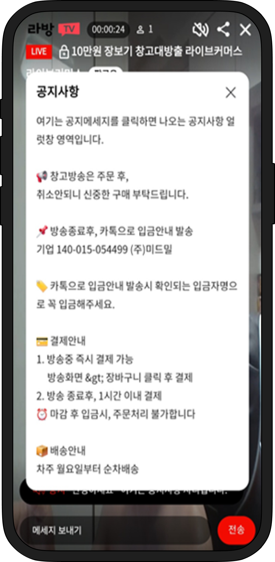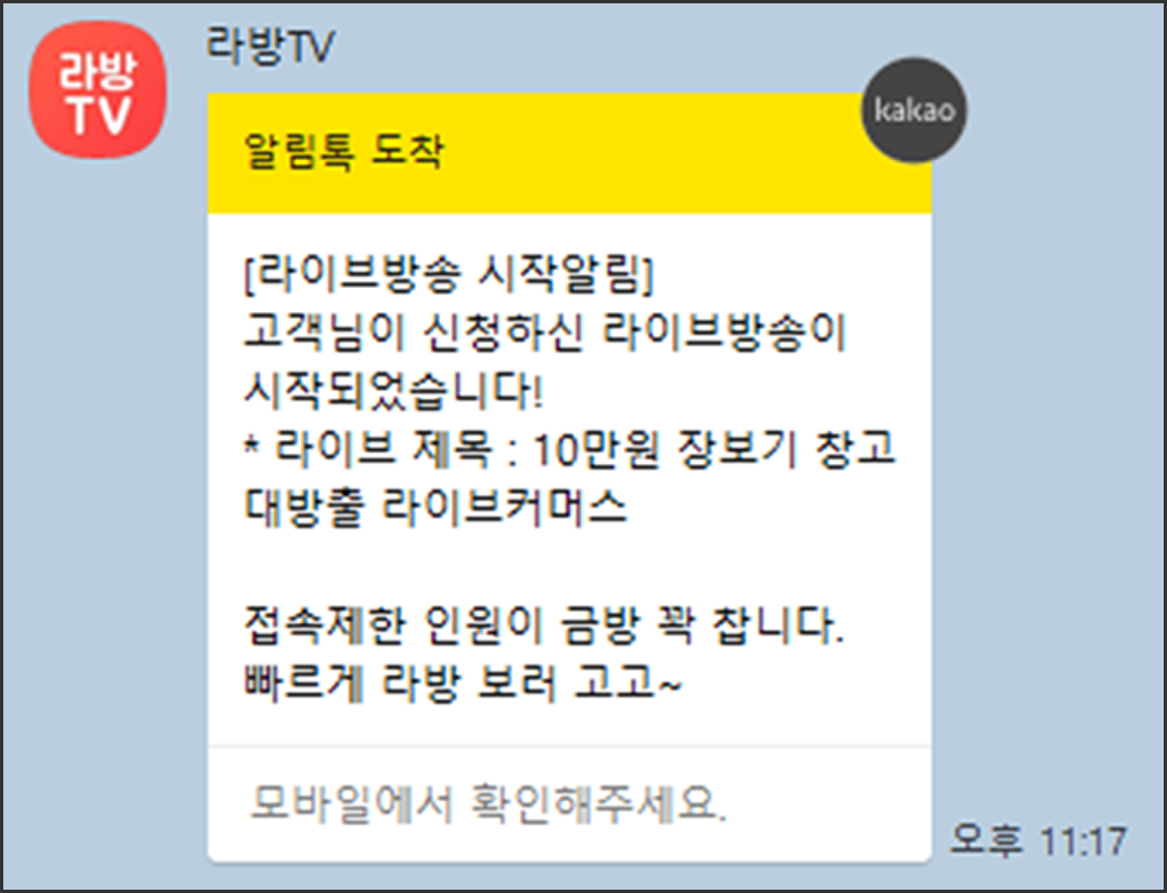 라이브방송시작하면 팔로우회원과 알림받기 설정한 회원에게 알림톡이 발송됩니다.