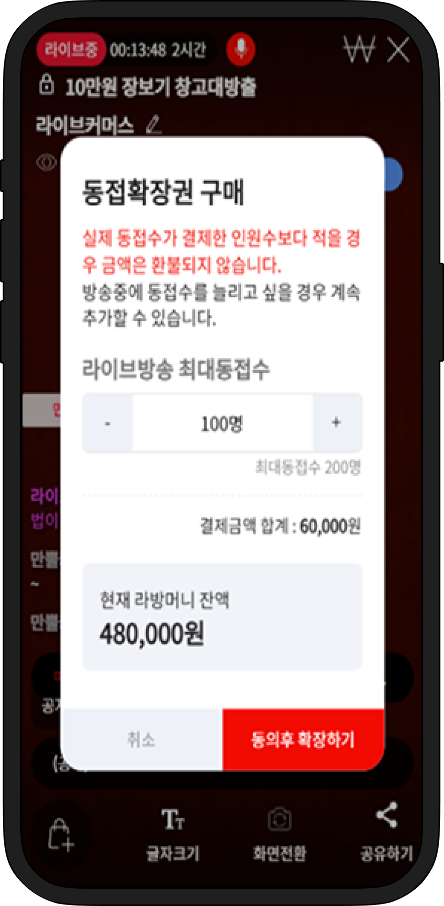 최대동접수를 설정합니다. 기본 50명이며, 50명씩 증가합니다. 100명/10분당 10,000원씩 차감됩니다.