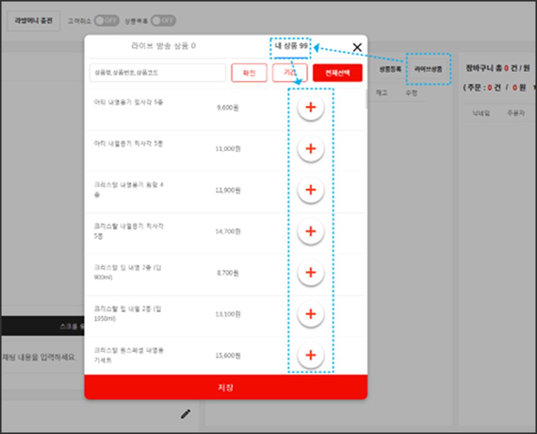 진행할 상품을 먼저 등록합니다. 물론 라이브중 등록할 수도 있습니다. 하지만 진행할 상품이 많은 경우 엑셀대량등록으로 진행하시면 편리합니다.